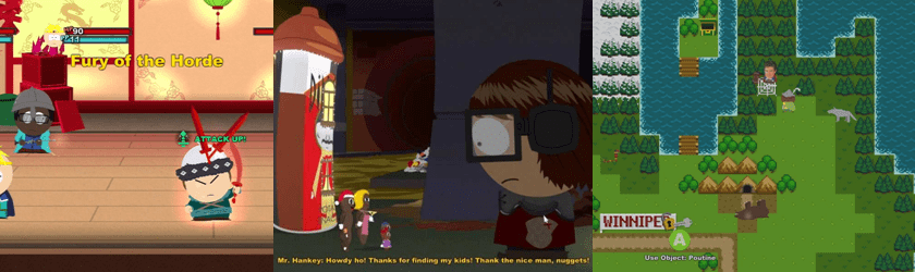 The game’s length is padded by the sheer amount of side quests and things to do, see, and collect; it’s easy to waste a lot of your time veering away from the main story mission to beat up homeless people on behalf of the Mayor or transport messages across the length and breadth of Canada. Battles are quick and fun, requiring a bit of strategy at times but nothing that’s going to cause you game-breaking frustrations (with the possible exception of learning the “Sneaky Squeaker” from Randy Marsh), and I never found myself bored while playing. Quite the contrary, in fact, as I constantly found myself being immersed in the South Park world thanks to the game’s top–tier presentation. For as long as it is, though, the game is quite short but, thankfully, the sequel offers more of the same, expanding and improving upon it where necessary and, between the two of them, both games really exemplify the right way to adapt cartoons into a videogame.