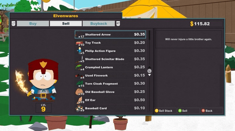 As you explore South Park, it’s recommended that you attack and interact with everything you see to find new armour, patches, weapons, items, junk, and cash. Fittingly, the game’s money is measured in small amounts; you’ll generally find a few cents lying around and resources only cost a few dollars or so but you can sell your useless junk or unwanted items to make more money. When you venture to Canada, though, you’ll have to contend with their higher prices and exchange rate but I never found myself strapped for cash or wanting for resources; if your inventory is full, you can usually return to the item chest or location and pick up whatever you couldn’t carry later on if you really want to.