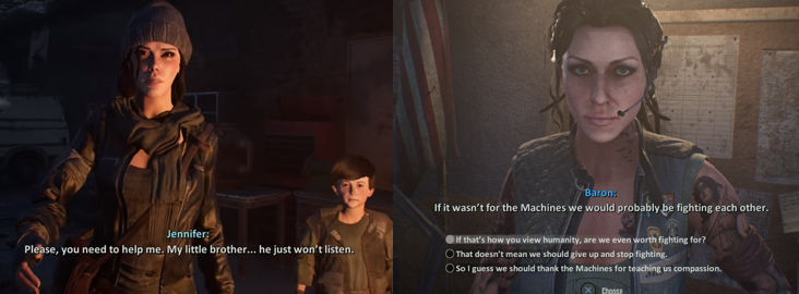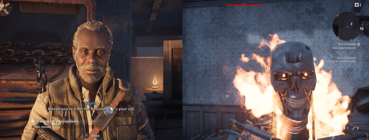 One of the big mechanics of Terminator: Resistance is the emphasis on story and character interactions; you’ll talk to a wide variety of non-playable characters, from scavengers to children and other Resistance fighters and commanders, all of whom have their own stories and opinions. Often, you’ll be asked to pick from a couple of options and what you choose depends on how close your relationships with these characters grow and the endings you’ll get. As there are no Achievements tied to these interactions, you can simply skip through all the dialogue and pick whatever you want and the only real consequence will be that some characters live, die, or fuck you depending on how well you do. These NPCs will also set you optional side quests, which are generally easy enough to accomplish so it’s worth taking the time to complete them if only to take in more of the game’s environments and earn some more XP; in fact, there’s only one point where you absolutely will fail one of two side quests as you’re given the option of killing a man or sparing him, which is a bit of a black mark on your record.