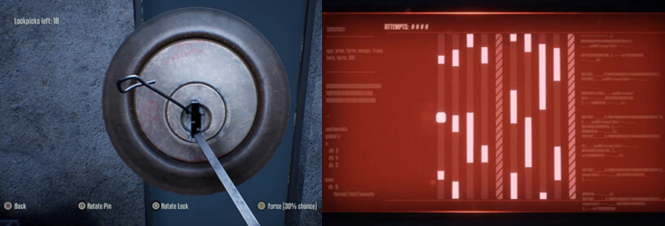 Once you become better equipped, your combat options become much more versatile and you can be much more proactive against the machines. Still, you can’t just go in all guns blazing against rooms full of T-800s and may have to content with multiple different enemies in a single environment, meaning you’ll have to switch between staying out of sight of HK-Aerials, picking off Silverfish with your sound decoys, and blasting T-800s in the face from behind or around cover. If worst comes to worst, though, you can always try to run past enemies but a lot of the time your objectives are directly tied to clearing areas of enemies. Luckily, other Resistance fighters are often on hand to offer back-up (or be invulnerable human shields) but make sure they don’t steal your kills (and, thus, your XP in the process). It’s not all sneaking about and combat, though; often you’ll need to use a lockpick to open doors. Lockpicks can be found and crafted and you’ll need a lot of them as they tend to break on the harder games and because the controls are so finicky; basically, you have to rotate each analogue stick to find the sweet spot, which can be tough the first few times but then either you eventually get into the rhythm or the game just decides to let you win (though you can also try to force the lock, which is generally easier despite the higher risk of the pick breaking). You’ll also make use of a hacking device to hack turrets (which is super useful as they’ll attack other machines on your behalf) or open doors, especially in Skynet bases and facilities; these mini games are basically a horizontal version of Frogger (Konami, 1981) and see you moving a small, 8-bit dot across moving pathways while avoiding collisions.