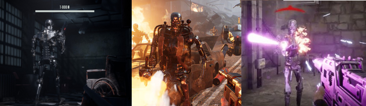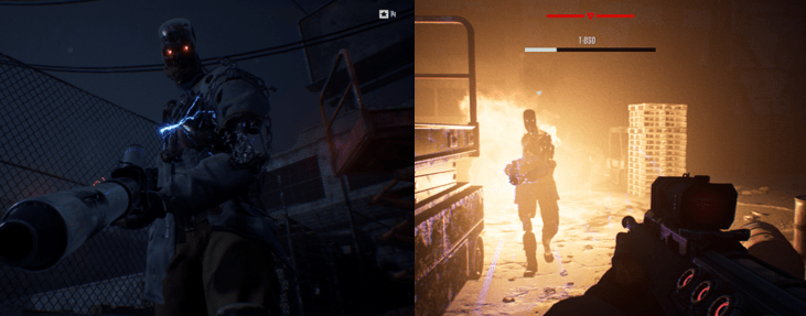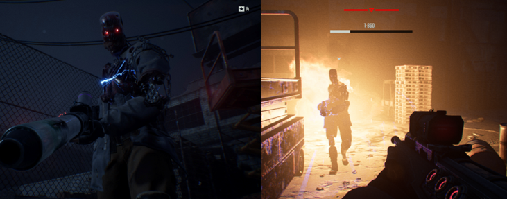 You’ll also do battle against the T-850, which is the infiltrator model of the T-800, covered in human flesh, and wields a far more powerful Plasma Rifle. The T-850 can also absorb a great deal of punishment (with more and more of its exterior suffering damage as the fight goes on), retreats behind cover and out of range, and even throws pipebombs at you from a distance. Eventually, you’re left to finish it off by yourself, which can be a daunting battle but it’s also ridiculously easy to trick it into going around in circles around parts of the environment. Later in the game, you’ll be stuck in a narrow corridor with only a few pillars for cover and trapped in the burning remains of the Resistance base but, in both cases, you’ll have access to far more powerful weapons to make short work of the T-850.