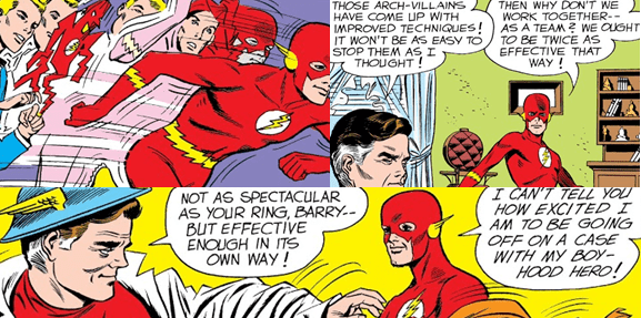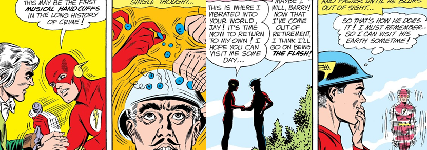Jay and his wife, Joan, are shocked at Barry’s expert knowledge of Jay’s history and even more awestruck when Barry explains that he is the Flash of a parallel world. Barry goes on to explain the basic fundamentals of DC’s multiverse: their two worlds exist in the same space and at the same time but are separated by different vibrational frequencies. He theorises that both Earths evolved almost exactly the same but that “destiny must have decreed there’d be a Flash — on each Earth!” It is only after explaining his multiverse theory that Barry brings Jay and Joan up to speed on his origin; during an experiment, he was struck by a errant lightning bolt (a common occurrence, as you well know…) and bathed in a mysterious chemical concoction. The result was the development of his own super speed but he was directly inspired to become the Flash after reading of Jay’s adventures in comic books on his world. Barry even further speculates, ridiculously so, that real-world writer Gardener Fox must have somehow been attuned to Jay’s world to dream up stories of the Golden Age Flash’s adventures. Jay is intrigued at the concept and in awe of Barry’s fourth dimensional Flash ring; he reveals that, despite no longer having the endurance of his prime years, he’s as fast as ever and in the midst of mounting a dramatic comeback thanks to a series of mysterious robberies that have been happening all over town. Ever the helpful chap, Barry offers to assist and the two solidify their partnership and newfound friendship with a hearty handshake. It’s then revealed to the reader that the perpetrators of these crimes are three of Jay’s most notorious rogues: Isaac Bowin/The Fiddler, Clifford DeVoe/The Thinker, and Richard Swift/The Shade. All three have a personal grudge against Jay for apprehending them “more than a dozen years” ago and, since their release (or escape, it’s not made entirely clear which), each has refined their abilities and gimmicks to take their revenge (the Thinker’s “thinking cap” allows him to cause anything he thinks of to happen within fifty yards of himself, the Fiddler’s Stradivarius violin allows him to generate destructive sound waves, and the Shade can conjure absolute darkness with his special cane).
