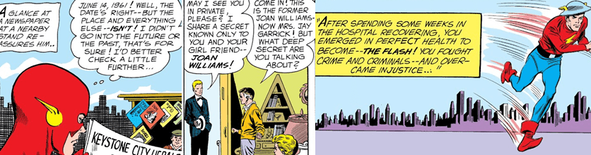 Like all good superheroes, of course, Barry is currently keeping his dual identity a secret from Iris and is able to use his position with the Central City Police Department to explain that he is “friends” with the Flash. This allows him to arrange for the Scarlet Speedster to make an appearance at Iris’s show for local orphans and also gives the Flash an opportunity to show off the near limitless potential of his superhuman speed but, in the middle of vibrating a rope at super speed, the Flash suddenly vanishes from sight! Though momentarily disorientated, the Flash quickly surmises that he must have vibrated his molecules so fast that he passed through “some sort of space-warp” but, when he attempts to return to the community center, is shocked to discover he’s now in a strange, vaguely familiar place named Keystone City. Recognising the name, Barry confirms his suspicions by looking up Jay Garrick in a telephone book and paying him a visit (as an interesting side note, Garrick’s house number is 5252, which goes a long way to explaining DC’s later obsession with the number fifty-two). Rather than introduce himself and get Jay, and us, up to speed, Barry decides to regale us, and Jay, with Jay’s origin story: while a student at Midwestern University, Jay inhaled fumes of “hardwater” and, somehow, gained super speed and began a career as the Flash.