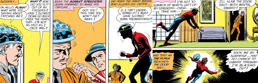 In the process of their revenge, the three villains are also indulging in elaborate crimes to bring themselves notoriety, fortune, and, presumably, to attract the attention of the Flash and the two Flashes immediately divide their efforts in order to uncover the culprits behind these crimes. The Thinker heads to the home of millionaire Edward Jarvis to steal the priceless Neptune Cup; he uses his thinking cap to persuade Jarvis’s guard dogs to lure the Flash into his trap and is easily able to manipulate Jarvis into handing the treasure over to him. When the Jay conveniently races by, the dogs literally follow the Thinker’s command by talking in English! Jay rushes into the house to confront the Thinker but is shocked to find that the villain continuously eludes his grasp; driving himself to near exhaustion in the effort, Jay laments what he believes to be a by-product of his advanced age but it turns out he’s only half right. The Thinker has been conjuring “mental mirages” to distract and tire out the Flash and, with Jay too weak to pursue him, is easily able to slip away with his prize as Jay blacks out from fatigue. Why the Thinker didn’t use his special cap to control Jay like he did Jarvis is beyond me, though…