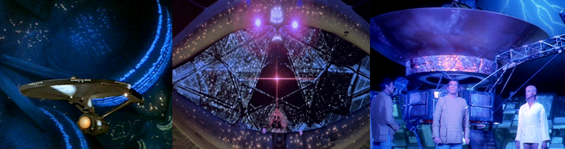 Instead, the Enterprise is manned by a larger unfamiliar crew, the most prominent of which is Lieutenant (Junior Grade) Ilia (Khambatta), a Deltan who acts as the ship’s navigator and has a previous relationship with Decker. Unfortunately, any chance of this relationship being rekindled, or of exploring Ilia’s personality, are quickly dashed when V’Ger abducts her, apparently kills her, and has a robotic duplicate assume her form and act as its emissary. Though now a robotic lifeform, the probe contains Ilia’s memories and experiences, which it is briefly able to reignite through Decker’s influence. The antagonistic force of the film, V’Ger, is the original “cosmic cloud”; a mysterious, incredibly powerful, and seemingly malevolent force that contains a form of consciousness far beyond anything previously encountered. Capable of launching devastating energy attacks, it overcomes its difficulties in communicating with its Ilia double and appears to be a sort of vast ship whose design and concept are more than a little reminiscent of the Borg. V’Ger’s goal is based upon a misinterpretation of the programming of Voyager 6 by an alien race of living machines to assimilate information and then return to Earth and “The Creator”, meaning that the entity is far from malicious and is, instead, a titanic machine that has gained sentience and is simply trying to understand its purpose and is little more than a demanding child. However, when V’Ger’s attempts at communicating with its creator go unanswered, it comes to believe that “carbon lifeforms” have infested the Earth and threatens to eradicate the infestation to fulfil its mission to return to its creator.
