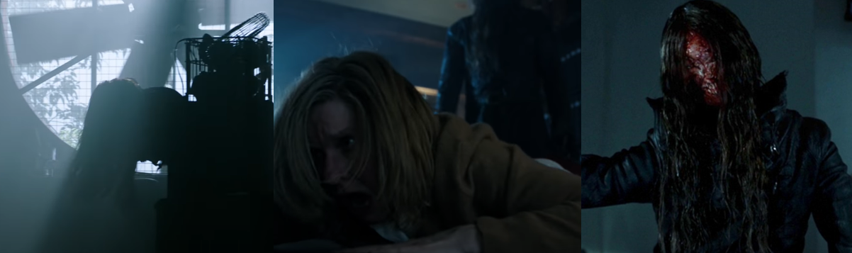 Quite soon into the film, the killer identifies himself as Gabriel; he exhibits the same croaking, cackling voice as Gabriel and also the same control over electricity and lights. The killer is presented as both supernatural and tangible, appearing as an ominous and genuinely frightening black shadow when in Madison’s dreams and visions and as a lanky figure in a trenchcoat with long hair and wielding a trophy fashioned into a deadly knife. His movements are erratic and inhuman and remind me more than a little of the unsettling Onryō from film series like Ringu/The Ring (Various, 1998 to 2017) and Ju-On/The Grudge (Various, 2001 to 2020); the few times we do see his face, he’s a scarred monster of a man and he exhibits an unnatural control over his limbs and incredible superhuman strength, to say nothing of exerting a seemingly supernatural influence upon Madison. His design is extremely effective and makes for some effective scares; scenes are often framed in a way to keep areas of shadow in the background, meaning you’re constantly on edge waiting to catch a glimpse of the killer, and his tendency to bleed out of the darkness or appear out of nowhere makes for some effective jump scares. The film also benefits from his uncanny and superhuman prowess during one particular scene that sees him effortlessly slaughter almost an entire police precinct and the startling reveal of his true nature and connection to Madison completely changes the context of the film and asks for a repeat viewing.