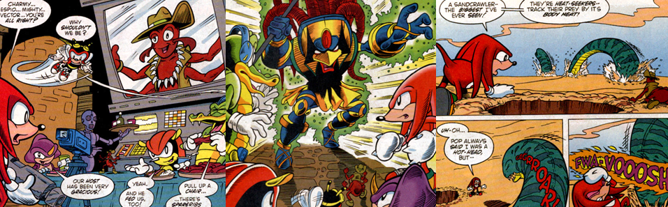 As Knuckles explores his surroundings, he arms himself with a concussive blaster (because that’s what I always think when I think of Knuckles: guns!) and forces his way into the grand observatory at the heart of the temple…only to find that his friends are being treated to a glorious spread as guests of Archimedes, who is revealed to be a weird-looking anthropomorphic fire-ant (yeah…I don’t know, either). Considering all of the games, subterfuge, and questionable behaviour shown by Archimedes, Knuckles is understandably enraged and demands answers but any hostilities between the two are interrupted by the arrival of Enerjak, who broke free from his prison when Knuckles triggered Mount Fate’s traps. Although Knuckles dismisses the Pharaoh-esque madman as a fraud, Enerjak boasts the incredible, unmatched power of eleven Chaos Emeralds (Archie Comics had an almost incalculable number of the gems at the time) and proves his power (and to be more than a match for the combined might of Knuckles, Chaotix, and Archimedes) by overpowering them all, taking Chaotix captive, and blasting Knuckles and Archimedes to the blazing hot desert of the Sandopolis Zone. As the two begin the bleak, day-long journey across the outback, they are attacked by a giant sandcrawler. However, the beast is easily defeated and turned into late-night kebabs for the two when Archimedes uses himself as bait (and his ability to teleport) to trick it into colliding head-first with a stack of rocks. Afterwards, Archimedes regales Knuckles (and bores the shit out of me…) with the story of how his people watched as the Echidnas harnessed the power of many Chaos Emeralds to move the entire city of Echidnapolis out of the path of an incoming comet (why they didn’t just evacuate is beyond me) thanks to the fire-ants performing the “ground-breaking ceremony” to effectively birth Floating Island. Archimedes then recounts, in a little bit more detail, how Dimitri later fashioned the “Chaos Siphon” to absorb the power of eleven Chaos Emeralds and ended up burying himself in the process.