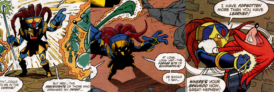 Jesus, what a slog. I’ll be the first to admit that Knuckles is my absolute favourite Sonic the Hedgehog character and I remember being so excited when he debuted in Sonic the Comic (1993 to 2002) and to learn that he was a prominent feature in the Archie comics, which were seen as kind of a continuation/parallel to Sonic the Hedgehog/SatAM (1993 to 1994). Knuckles the Echidna was one of the longest-running spin-off of the Archie Sonic comics, which is a testament to the character’s appeal and popularity, but every time I read his solo run I can’t help but be astounded at how boring and preposterous it is. I don’t usually lark to harp on about this sort of thing but my God is the art terrible in these issues! The covers, drawn by the always amazing Patrick “Spaz” Spaziante, are the best part of the artwork in this miniseries as, while Knuckles generally looks kind of okay, a lot of the characters just look really weird and disproportionate. I can kind of understand it as the majority of the Chaotix are really weird character designs already but Archimedes and the rest of the fire-ants just look ugly, man. Environments are very bland and nonsensical as well and all three issues suffer from the same artistic inconsistency that plagued the Archie Sonic comics for about fifty issues or so. There are, however, some impressive moments in the issues, though. In the rare instances where Knuckles is gliding or in action, he looks suitably bold and striking and, while Enerjak’s design is a bit “busy”, he looks pretty distinct and intimidating and I love how he has all this Egyptian-inspired apparel on his armour. Thanks to having absorbed the powers of eleven Chaos Emeralds, he can fly, wields Chaos energy, and is able to render targets under his control or unconscious and seems to have enhanced durability and strength, and can even erect a fully-functional city and robot minions in just a few panels.