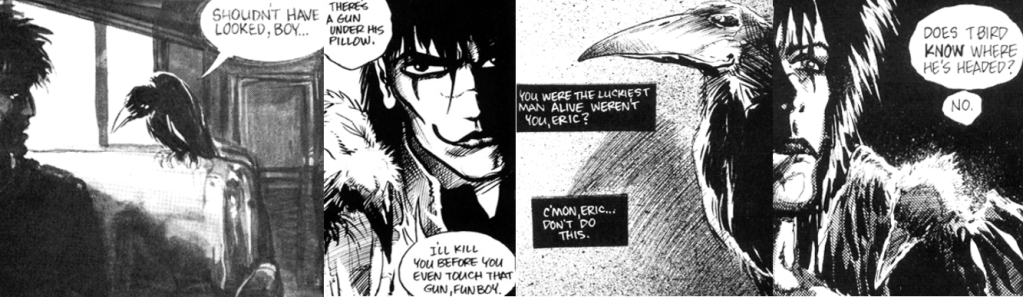 Unlike in the film, only Eric can see the crow; it advises him here and there throughout his mission but noticeably disappears between panels, indicating that it’s much more of a supernatural entity. It also has far less play then in the film; there, it was a mysterious guide and commonly seen at Eric’s side but, here, it appears sporadically and directly communicates with him, chastising him for constantly tormenting himself with memories of his past and distracting himself from his vengeance. In one of the interludes, the Crow chastises Eric for losing himself to the throes of passion with Shelly in what appears to be the closest representation of his paradise, before the conductor (now dressed as a Skull Cowboy) violently shoots Shelly in the head and forces him out of his heaven. In another, the crow scolds Eric for juicing up on Fun Boy’s drugs and reliving sexual memories of him and Sherry; while the crow is overly blunt and direct, it’s clear that it cares about Eric, his feelings, and his need for revenge and just wants to keep Eric on track rather than constantly dwelling on the past. After Eric is shot and left for dead, the crow immediately appears before him and its first advice is to turn away from the horrors being performed by his killers; it tries to comfort him by telling him that it wasn’t his fault and then chastises him for clinging to life, eager to give Eric the power to avenge himself on his killers.