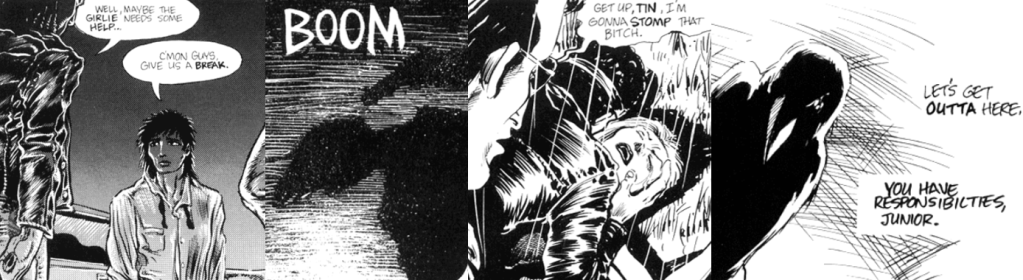 After following the Crow’s vicious and bloody path of vengeance throughout the story and being treated to brief flashbacks and memories of Eric and Shelly’s lives together, the final chapter shows us exactly what happened to the two on that fateful night. After proposing to Shelly, Eric takes her on a night out to celebrate but, on their way home, their car suddenly breaks down. As Eric is attempting to fix it, T-Bird and his cronies, completely off their heads on cocaine, alcohol, and other drugs, randomly happen to drive past them and, spotting Shelly, decide to circle back and harass them. Eric has Shelly lock herself in the car and attempts to reason with the gang and, for his efforts, is violently shot in the bac of the head by T-Bird. The bullet blows part of his skull off (giving him the scar over his nose and the one glazed over eye we’ve seen him sport throughout the book as the Crow) but doesn’t actually kill him. Even when T-Bird follows this up with a second, direct shot that briefly sets Eric’s hair on fire, Eric still doesn’t die; instead, he’s left helpless and paralysed on the cold, wet road and forced to watch as Shelly is beaten and raped by the gang before being killed by T-Bird. As Eric lies there, mortally wounded and barely clinging to life, he is berated by a vision of the crow, who begs him not to look and urges him to give up the mortal coil so that he can have his revenge.