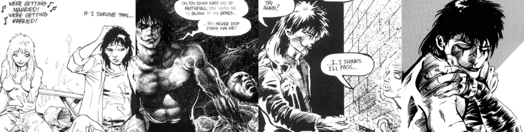 The Crow’s mission is fuelled by rage and a lingering sense for brutal justice; there’s very little “heroic” about the Crow in that he’s acting solely to appease his need for vengeance rather than for the benefit of others. However, he remains a tortured and vulnerable character; he has no desire to hurt Albrect or those who aren’t on his list and shows a great deal of love for Sherri. At the heart of his motivation is, of course, Shelly; he curses a God who would allow someone as beautiful and innocent as Shelly to be molested and murdered in such a violent fashion, and who would allow him to suffer so badly by association, and regards the scum he guns down and brutalises as being little more than vermin deserving of punishment. Eloquent and largely impassive, the Crow is prone to bouts of intense rage and emotion when avenging himself; thanks to being undead, he has nothing to fear and willingly walks into gunfire and knives without hesitation. Although the comic doesn’t actually go into detail in explaining exactly what Eric has become, how he was resurrected, or the extent of his powers, it’s largely inconsequential to the story; all you need to know is that he is retribution personified on what he sees as a Holy mission to purge the city of undesirable sinners. The Crow remains a powerful, intense, and brutal tale of revenge and love; it’s far from a traditional comic book story and is more akin to a Gothic mediation on loss and chaotic emotion, and is bolstered by some great use of shadows and pen work. The black-and-white art style makes the story as beautiful as it is violent and it remains a passionate, tragic story to this day; it’s made even more enjoyable for fans of the movie as the film directly lifted entire scenes and dialogue from the original comics and perfectly captured, and expanded upon, the atmosphere of this dark, gritty story that I would definitely recommend everyone check out.