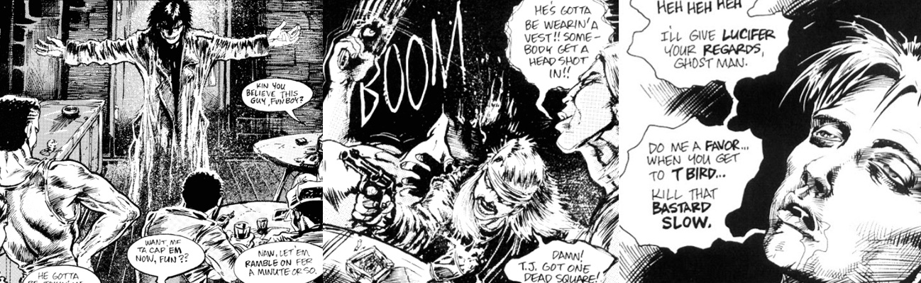 On his way to confront Fun Boy, Crow comes across a young girl, Sherri, whose mother is one of the punk’s concubines. Feeling a connection with the girl’s innocence, the Crow gifts her with Shelly’s engagement ring, much to the girl’s emotional appreciation, and promises to return her mother to her. Later, before bringing his vengeance to an end, the Crow bids a heartfelt farewell to Sherri and promises her that things in her life will one day get better, or at the very least she will find serenity in the afterlife. Barging in on Fun Boy and Sherri’s mother in bed, the Crow demands that she leave and compels her to do better by her daughter with the memorable “Mother is the name for God” line, before getting into it with Fun Boy. Unlike his film counterpart, who was a wacked out junkie, the comic book Fun Boy is far more defiant and integral to the plot; he talks snark to the Crow and agrees to gather the rest of the gang together in a bar for a big gun fight. After intimidating the hugs with his loquaciousness, the Crow dispatches them in a blood-soaked battle that sees him burying an axe in one guy’s neck and gunning them all down with two pistols without missing a single shot, all while shrugging off any bullets that happen to hit or graze him until only Fun Boy is left. Unlike his associates, he doesn’t beg or plead or even repent for his actions; instead, he owns his reprehensible actions and even admits to perpetrating even worse acts against his fellow man. Tired of all the killing and vengeance, the Crow demands that Fun Boy go and get T-Bird so that they can finish this where it all started, at the side of a road outside of town where Eric and Shelly were tortured and killed. In return for Fun Boy’s assistance, the Crow promises him a quick, clean death, but makes no such promises for T-Bird, the man who pulled the trigger on himself and his lover.