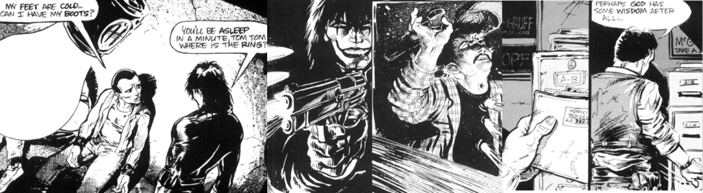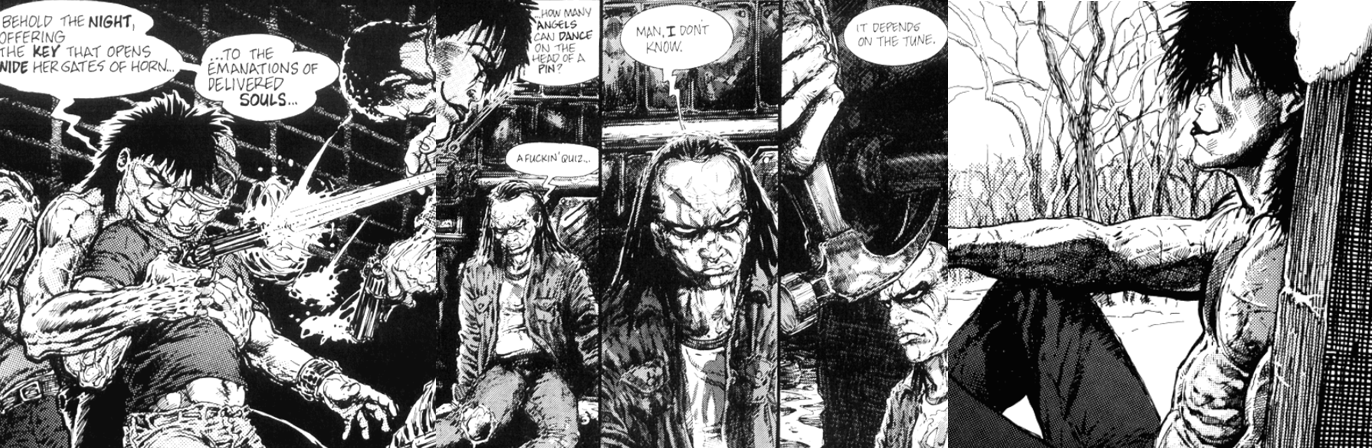 Each chapter of the story is preceded by a quotation or a short poem that sets up the theme of the chapter, and the entire book, be it “Pain” or “Night”. Flashbacks to Eric’s journey to the afterlife, or his far happier life, are rendered in a far different visual style; these are beautiful, soft paintings rather than harsh pen strokes of black and white and, from the very first interlude, set the tragic tone for the entire story. “Shattered in the Head” appears to show Eric in a dream-like memory of riding a train but is, in actuality, a representation of his journey to the afterlife; he sees a beautiful white horse get tangled up in barbed wire, suffering in agony as it bleeds to death, which is an obvious parallel to how Shelly died. Just like in that instance, Eric was helpless to do anything to help and powerless to do anything but look on in horror, something which the Crow admonishes him for as the skeletal train conductor as for his ticket (an obvious representation of the Grim Reaper or, more specifically, Charon, with the train being an interpretation of the ferry he uses to take souls to the realm of the dead). Another interlude shows the Crow performing Kata-like dances while brooding over pictures of his former life and being tormented by memories of Shelly’s dead; we also see that the Crow regularly engages in self-harm, cutting and scarring his arms and wrapping them up in black tape in an attempt to either commit suicide and return to his love or feel something, anything, other than his eternal emotional torment.