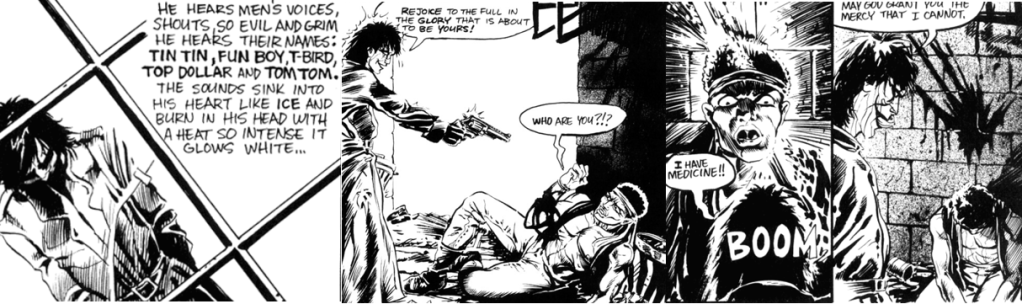 When the story proper begins, both the art and the presentation has shifted somewhat; text boxes allow us into the mind of the ghost-faced vigilante, now identified as “The Crow”, who stalks through the murky city streets and broods in an abandoned house outside of the city, constantly reliving the memory of a girl being attacked, though he cannot remember the exact specifics. All he can think about are the names of those responsible, and we transition over to find one of them Tin Tin, testing out a gun on a hapless pedestrian. He guns down the seller, and the little punk who arranged the sale, caring only about sending a message to Top Dollar’s would-be competition and little for the innocent woman’s cat, Gabriel, who would be left homeless as a result of his actions. Thankfully, we don’t have to wait long for Tin Tin to pay for his reprehensible nature as the Crow immediately confronts him down a dark alley; showing no fear and completely no-selling an errant shot to the head, the Crow downs Tin Tim with a bullet to the wrist and, after bombarding Tin Tin with nonsensical religious statements, triggers his victims memory by detailing his part in attacked a man and a girl on a cold October night. Although Tin Tin begs for his life, pinning the blame entirely on T-Bird and the drugs they were on, the Crow, wracked with fragmented memories of happier times, shows no mercy and blows the asshole’s head clean off.