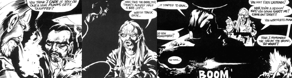 The Crow ties a shotgun shell into his hair to indicate that the first of his victims has fallen, and Tin Tin’s death causes some concern amongst his shit-kicking associates; Top Dollar, the self-styled head honcho of the neighbourhood, is unconcerned, however. He doesn’t give two shits what the street punks think about it, or that Tin Tin got killed, and vehemently asserts that he owns the dope, the neighbourhood, and that “[his] word is the law!” Top Dollar is quickly convinced to give a shit, however, when the Crow gate-crashes the meeting and guns down everyone there. Some of the punks are sporting bulletproof vests, but the Crow is as unfazed by this as he is by their wild bullets, which strike him and draw blood but do not drop him, and simply executes them with a shot to the head while preaching a sermon on their evil ways. In the end, only Top Dollar is left; he attempts to barter for his life with money and drugs, but the Crow ignores him and simply stoically tells his story of a man, a woman, and a 1971 Plymouth on a rainy night. the second Top Dollar admits to remembering what the Crow is talking about amidst his angered ranting, the Crow executes him with two shots to the head. That’s right, in the original comic book, the Crow went pretty much directly to the top of the pecking order and then worked his way down, rather than working his way up the chain of command in the gang responsible for his suffering, showing him to be slightly more efficient and direct than his filmic counterpart.