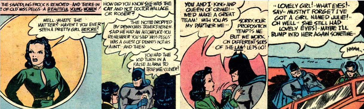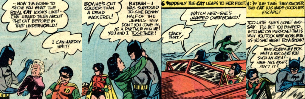 Anyway, Robin catches Batman up to speed and the Dark Knight immediately suspects that Denny is in league with the Cat, but has his own suspicions about who amongst the guests is the enigmatic Cat. He exposes the true culprit by making a splash at Martha’s costume party, handing over the stolen jewels and spotting that the elderly Mrs. Pegg is quite spritely (and shapely) for an old woman when she races off at the sound of a fire alarm. Mrs. Pegg tries to make a run for it but is collared by Robin and dramatically revealed to be a beautiful young woman in disguise. Batman then wallops Denny when he tries to take the necklace at gunpoint, but turns down the Cat’s proposal that the two of them join forces as partners in crime. However, when the Cat leaps overboard while being transported back to dry land, Batman makes no attempt to stop her and even gets in Robin’s way when the Boy Wonder tries to pursue her. Robin is less than impressed by how smitten Batman was with the Cat, and the issue ends with the Dark Knight musing over the beautiful thief’s captivating eyes.