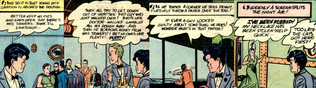 Our story opens to find a luxurious yacht, the Dolphin, out on stormy seas, where Dick Grayson/Robin is currently working undercover. We learn that, some days prior, wealthy philanthropist Bruce Wayne spotted in the newspaper that Martha Travers arranged for a select group of guests to join her on a yacht party and get a glimpse of her ludicrously expensive emerald necklace. Bruce has a hunch that this will attract every crook in town; however, since he has a prior engagement, he requests that his ward take point on this investigation, something Dick is only too eager to sign up for.