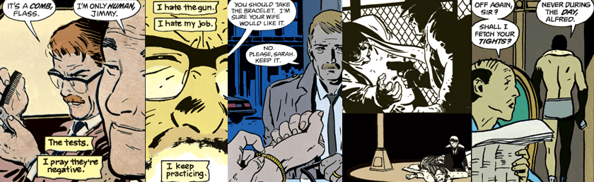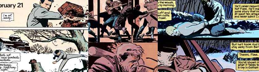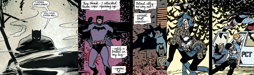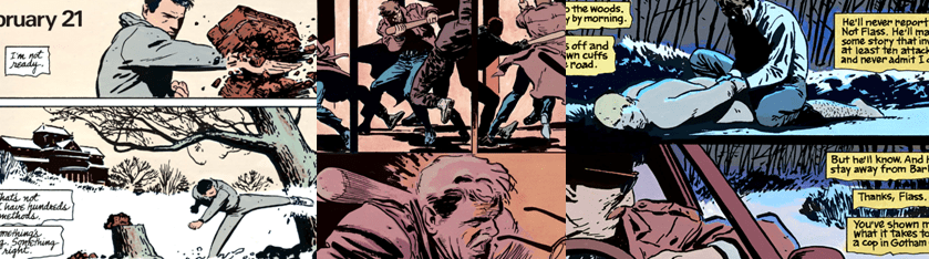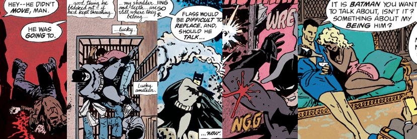 It’s interesting that Batman: Year One is such an effective Batman story considering it’s much more of a Jim Gordon story. We learn very little about Bruce, his background, or his training and, instead, focus more on Gordon and his struggles to adjust to and cope with life in the city. Everything we learn about Gotham and the state of its police force comes from Gordon, a flawed man who has made mistakes and is trying to hold onto his morals but struggles in the face of near-endless corruption and his own temptations towards Sarah. Bruce’s tragic origin is recounted very briefly and much of his training and motivation is delivered through exposition or his thought boxes, which take on a cursive slant that can be difficult to make out at times. Still, it provides a fascinating glimpse into Bruce’s early struggles to find the means by which to fight crime in the city and the preparation that goes into his various traps and assuming the guise of the Batman. At its core, Batman: Year One is a story of struggle and trust; both Gordon and Bruce struggle to find their place in Gotham and figure out how to conduct themselves and their mission in a city that is constantly fighting back against them and both of them feel alone in this endeavour. It isn’t until their paths cross and they see how selfless the other is that they both begin to consider changing their position; while guys like Branden just want to shoot Batman dead no questions asked, Gordon would prefer to see him brought in alive to get to the root of his mystery and Bruce realises that he needs the good-natured lieutenant onside if he is ever to be effective as Batman and avoid getting shot on a nightly basis.