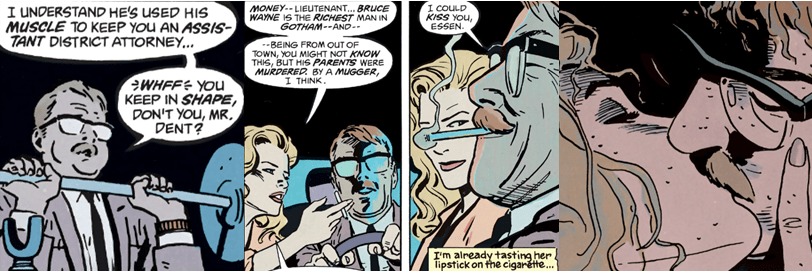 Humiliated by this incident, Gordon increases his efforts in trying to decipher the Batman’s true identity. Initially suspicious of Dent, it is Detective Sarah Essen who nudges his attentions towards Bruce Wayne because of his wealth and traumatic childhood. Over the course of the last few months and pages, the two have grown extremely close since Gordon is spending more and more time at work and trying to shield Barbara from the atrocities in Gotham. This leads to a passionate affair between the two that Gordon immediately hates himself for; his guilt is matched only by his confusion regarding Batman, who is clearly taking the law into his own hands and yet may very well be the most righteous and incorruptible person in the city. Bruce, however, is able to throw Gordon’s suspicions off by playing up the role of a wealthy, bored socialite but, after Batman’s efforts see Flass incarcerated for taking part in a massive drug operation, Loeb threatens to expose the Lieutenant’s affair to his wife.