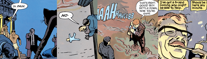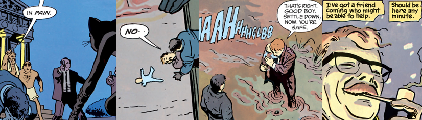 Coincidentally enough, this occurs on the very first night that Bruce attempts to strike back at the city’s criminal underworld; disguising his identity with some make-up and a fake scar, he goes out looking for trouble in the Red Light District and ends up taking a beating of his own. Stabbed in the leg, mauled by a cat-like prostitute, and shot by some of Gotham’s finest, Bruce manages to escape police custody and, with his last ounce of strength, stumble back to Wayne Manor. Bleeding out, he contemplates his failures and begs his deceased father, Doctor Thomas Wayne, for guidance on how to do better and to strike fear into the hearts of criminals. Tormented at having witnessed the brutal and random deaths of his parents as a small boy, he resolves to let himself die unless he can find the answer and, at that moment, a gigantic bat crashes through the window of his study. Just like that, Bruce has his answer and vows to “become a bat”. By April, Gordon has built up something of a reputation as a soft touch, which brings him into direct opposition with Sergeant Branden of Special Weapons and Tactics (S.W.A.T.) and the support of the press (which makes reprimanding him extremely difficult for Loeb). Gordon’s mounting aggravation and depression at bringing his wife and pregnant child to such a cesspit is interrupted by reports of a “giant bat” in the city as, across town, the Batman makes his dramatic first appearance. Thanks to his fearsome appearance and an animalistic growl, Batman is able to frighten a group of thieves a little too well as one of them topples over the edge of the balcony they’re on. So determined is Batman to keep the perp from falling to his death that he puts himself at risk to save the guy’s life and only manages to come out of it relatively unscathed due to his adaptability, strength, sheer for of will, and (as he chastises himself) a great deal of luck.