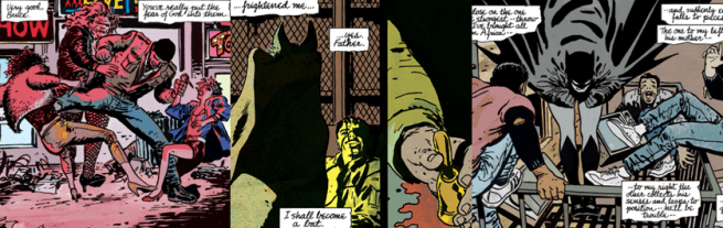 This comes to a head in the finale where, rather than Batman saving Gordon’s son, it is Bruce in a questionable disguise. Indeed, the artwork and dialogue makes it intentionally vague as to whether or not Gordon truly recognises his boy’s saviour or not and, in the end, he decides it doesn’t matter who the Batman is as he has learned to think of him as a friend in a lawless city. As a tale of Batman’s earliest days in action, it’s hard to get much better than Year One. Personally, I love Batman stories that show him to be vulnerable and flawed and we definitely see a lot of that here as he’s constantly being stabbed and shot and hurt and forced into tight corners. This is a Batman who is lacking many of the bells and whistles of his later career; there’s not really a Batcave, no Bat-Signal or Batmobile, and a limited array of Bat-themed gadgets, all of which means that Batman has to use his wits and adaptability a lot more than his fancy high-tech toys which, again, I also find incredibly appealing. The portrayal of Batman’s influence is equally great; most treat the idea of a giant bat-garbed vigilante as ridiculous until they come face-to-face with him and then they are scared witless and this goes a long way to painting the Batman as this urban myth amongst the just and unjust alike.
