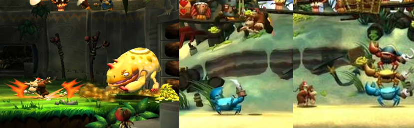Of course, eight worlds means eight different bosses to face; before you tackle each one, you’ll get to smash open a DK Barrel and I highly recommend that you take advantage of this as Donkey Kong Country Returns 3D’s boss battles can be quite laborious. The first boss you face, Mugly, is a giant toad-like creature that likes to charge or jump at you from one side of the arena to the other, producing shockwaves in the process. He also protects himself from attack with a row of spikes on his back, meaning your window of opportunity to jump on his back is limited to when the spikes are retracted or the times when he knocks him self silly. The second boss, the Scurvy Crew, is comprised of three crabs that you must jump on when their claws are down or roll into when they’re up. Though they also form a three-tiered totem, you’ll continue using this tactic but they move much faster as the fight progresses and it just seems never-ending at times, which can lead to you making stupid mistakes.