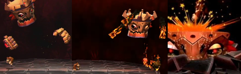 Easily the toughest boss of the game, though, is the final boss, Tiki Tong; as mentioned, you must endure a gruelling Rocket Barrel section to even reach this boss, which will most likely leave you with few lives or exhaust your inventory so you lose the much needed edge of Cranky’s items in the battle. Additionally, if you die while fighting Tiki Tong, you respawn right before the final fight but without Diddy, making it even tougher! Tiki Tong first tries to slap and crush you with its hands, which must be ducked under, rolled away from, or jumped over (when they’re at the far side of the arena) to avoid damage. When you dodge its downward slam, quickly jump on the jewel to damage and, eventually, destroy each hand (grabbing any wayward hearts you see in the process) and Tiki Tong will start attacking with its big, stupid head by spitting out Flaming Tiki Buzzes that will home in on you and basically blanket the arena, giving you the smallest window to avoid being hurt (the rare hearts that appear during this time are also on fire and you have very little time to wait or blow them out). Tiki Tong also crashes to the ground, producing a shockwave that you must jump over in a desperate attempt to bop the big red button on its head; miss-time your jump, though, and you’ll simply bounce harmlessly off the button for maximum frustration and the boss also increases in speed and aggressiveness as the fight drags on, giving you less and less time to hit that weak spot and crush it with the Moon when you finally do defeat it.