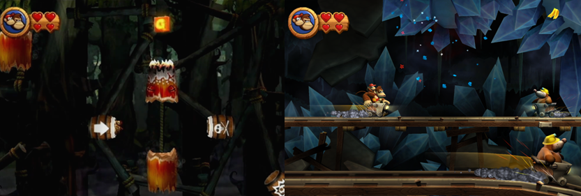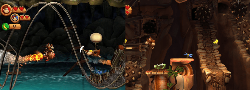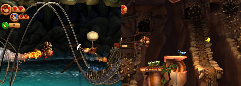 The game is pretty good, whoever, at mixing and matching gameplay mechanics from each world into another; so, you might have to dodge past collapsing pillars in the jungle but you’ll also find collapsible hazards in the cliff stage. Similarly, mine carts and Rocket Barrels appear invariably throughout each world and you’ll be asked to swing from vines and cling to grassy verges across the entire game. While each world has a unique theme and varies up the gameplay quite a bit, the emphasis is always on platforming and various methods of jumping and traversing the environment. This means that you won’t find any underwater stages in Donkey Kong Country Returns 3D, which would be a good thing but it results in water being an instant death hazard and replaces such mechanics with tiny, crumbling platforms, chase sequences, high speed jaunts on runaway mine carts or rocket-powered barrels, and precarious jumps over bottomless pits, beds of spikes, or bubbling lava as you hop from one tiny platform to another or ride a slowly deteriorating egg shell across a dangerous landscape. Other times, you’ll rush down water slides or have to outrun a giant Squeekly or stages are rendered entirely in silhouette or filled with a thick fog that limits your field of view and helps to mix up the presentation, though these instances were few and far between in hindsight.