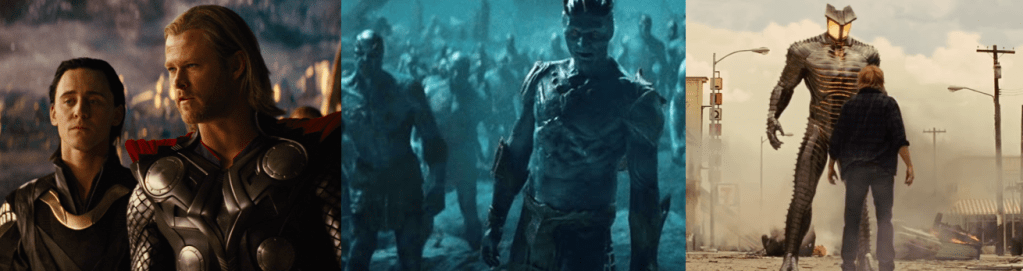 One of the things I absolutely love about Thor is the costume design and aesthetic of the film; Asgard is a gorgeous golden city full of wondrous and grandiose architecture and technology and its inhabitants, particularly our main characters, look absolutely fantastic all decked out in their armour and attire. Even now, the sheer spectacle of seeing the likes of Thor, Odin, and Loki in glistening armour remains impressive and I absolutely love how weighty Mjölnir seems and how intricate all of the costumes are. Clearly inspired by Olivier Coipel’s 2007 redesign of the character, Thor looks both familiar and suitably updated for his big-screen debut and I love how the film showcases even ridiculous aspects of his powers, such as spinning Mjölnir around rapidly in order to fly. That’s not to discount Loki, Heimdall, and Odin, who all look stunning as well; garbed in regal armour, Odin appears both wise and glorious and Loki looks both regal and menacing fully garbed in his green and gold attire and sporting a fearsome horned helmet. Add to that the visual of the Destroyer wrecking its way through New Mexico, the dark and dreary ice wasteland of Jotunheim, and the imposing, demonic appearance of the Frost Giants and you have a film that, while not necessarily action-packed like other MCU movies, is visually breath-taking to behold.