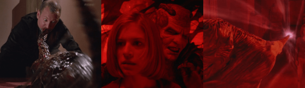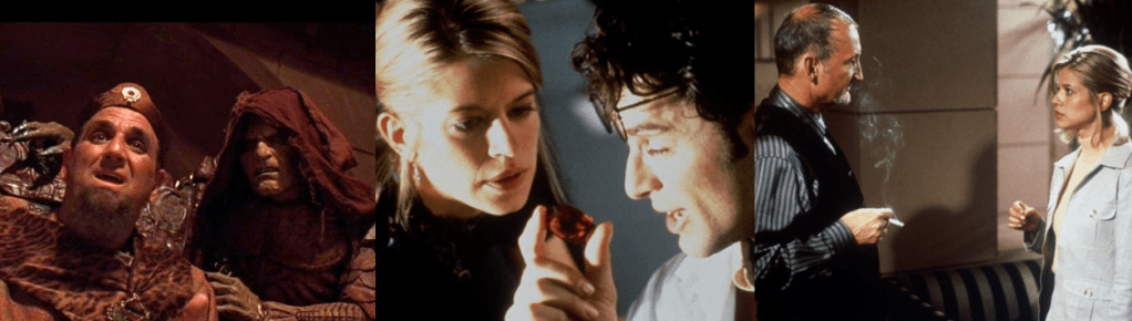 The film is then nicely bookended by the Djinn granting Beaumont’s wish for his big gala to be unforgettable, which results in one of his guests turning to glass and shattering, mutilating a bunch of others, and still more being set on fire or ripped asunder when Beaumont’s pictures and statues come to life and go on a blood-soaked rampage, with Beaumont himself puking up a hideous, squealing tentacled creature! It’s not just the gore where Wishmaster shines, however; the Djinn himself is one of the most disturbing and monstrous creatures ever brought to life. A hulking, demonic creature, he glistens with an unsettling ooze, intimates with his red eyes and prehensile horns, and resembles something more akin to popular images of Satan rather than Robin Williams’s whimsical genie. The Djinn actually has a couple of forms in the film; when he escapes the jewel, he’s this putrid, slug-like monster (Verne Troyer) capable of little more than crawling, and undergoes a sickening metamorphosis (Walter Phelan) after ending Josh’s suffering that more than recalls the body horror of Hellraiser (Barker, 1987), and even has a ravenous beast at his beck and call in his dark dimension. Once he assumes his Nathanial Demerest guise, his external horror may be subdued but his charm and menace are just as palpable thanks to Divoff’s captivating screen presence, and there’s an intriguing complexity to his villain since he’s capable of practically anything you can imagine but his magic is restricted to the wishes of other, lesser beings. After attempting to trick Alex by assuming Derleth’s form, the Djinn abandons his façade and reveals his monstrous true self to her, granting Alex a taste of his hellish dimension, a bejewelled void of ancient evil where he delights in the torment of the souls in his possession, and manipulates her with the agony of the souls he has claimed. Functionally immortal and impervious to physical harm and at the brink of ultimate success, the Djinn doesn’t think twice to grant Alex’s final wish, that Torelli hadn’t been drunk at the start of the film, and thus unwittingly undoes the entire movie since the statue never breaks and the fire opal is never discovered, leaving the Djinn trapped once again and allowing all lives and souls lost to be restored and the unknowing Alex free to pursue a life with Josh.