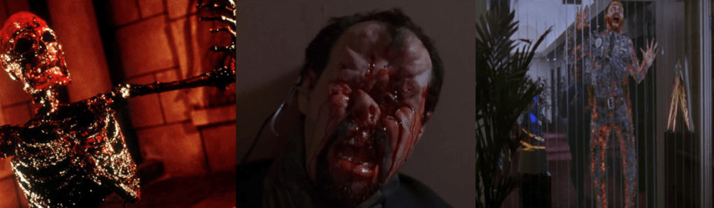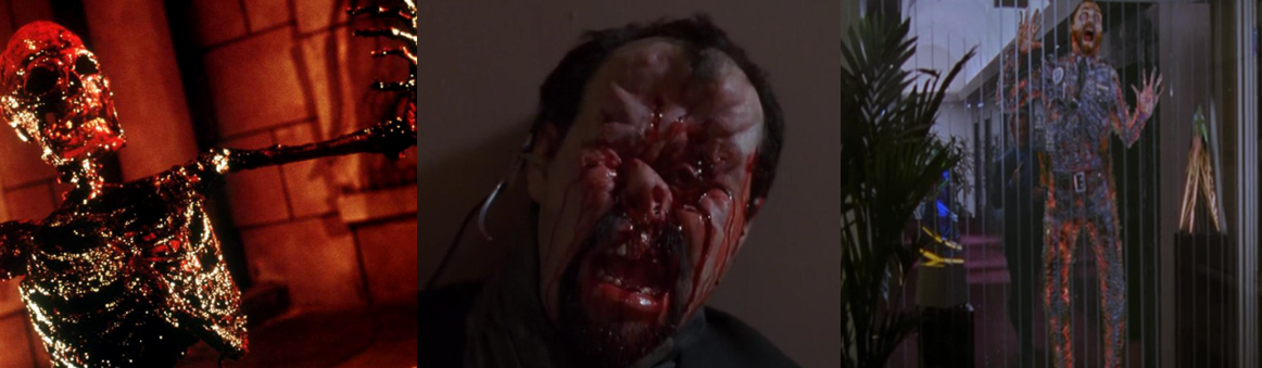 If there’s any reason to watch Wishmaster beyond Divoff’s magnetic and menacing presence, it’s the fantastically gory and unsettling special effects on show. We’re treated to an absolute orgy of blood and viscera in the opening sequence alone, in which the Persian emperor wishes to be shown “wonders” and is horrified to watch as his subjects are absorbed into the stone walls of his temple, trample over each other in a panic, suffer from horrendous diseases and injuries, turn to trees and human lizards, and even have monstrous jaws burst from their stomach. By far the most gruesome visual in this ghastly carnival of horrors is the depiction of a man’s bloodied and screaming skeleton literally forcing its way out of his body and pouncing on another in its pain and distress! And the harrowing deaths just keep coming once the Djinn is in the modern day; he coerces a cantankerous and bitter hobo (George “Buck” Flower) into wishing for an antagonistic pharmacist (Reggie Bannister) to die from cancer, resulting in the druggist collapsing and convulsing as a wretched form of super cancer eats him alive. He also grants a sales clerk’s (Gretchen Palmer) wish for eternal beauty by turning her into a mannequin, and renders a medical student (Brian Klugman) blind when he walks in on the creature ripping off and assuming Demerest’s face. The Djinn’s twisted sense of humour is at the forefront of every wish he grants; when Nathanson wishes to have unequivocal evidence of a known criminal’s guilt, the Djinn causes said criminal to shoot up the police station and even rip a guy’s jaw off! Though a security guard almost spares himself by sending Demerest away, he dooms himself to probably the poorest effect and death in the film when he goads the Djinn into turning him into glass, a death only surpassed in weakness by the fate of self-assured doorman, Johnny Valentine (Tony Todd), whom the Djinn “simply” leaves locked in a Chinese water torture cell.