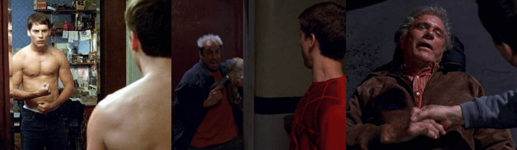 When he awakens, Peter is better than ever: his eyesight has improved, his body is muscular and defined and his reflexes are so attuned that time seems to slow when he perceives danger. Most obviously, he can now eject sticky webbing from his wrists and adhere to surfaces just like a spider and Peter is overjoyed at the revelation that he has gained the proportionate arachnid’s abilities. So caught up in his newfound superhuman powers is Peter that he forgets all about his chores at home and easily bests Flash in a fight; concerned about Peter’s welfare, Uncle Ben tries to reach out to his young nephew, understanding that he is going through “changes” that will come to define his adult life, but Peter spitefully rejects Ben’s advice and heads off to try and earn some money at a wrestling event. Wishing to buy a car to impress Mary Jane, Peter crafts a bright, colourful outfit for himself and takes on Bonesaw McGraw (“Macho Man” Randy Savage) inside a steal cage, easily toppling the muscle-bound braggart. However, when the wrestling promoter (Larry Joshua) stiffs him on the pay cheque, Peter willingly allows a thief (Michael Papajohn) to escape with the promoter’s money. This decision comes back to haunt him, though, when he leaves the arena and finds his beloved uncle dying in the street from a gunshot wound. Driven to a mindless rage at seeing his father-figure die, Peter puts aside his apprehension and uses his webs to swing across the city in pursuit of the culprit, only to find it’s the same thief he let escape earlier!