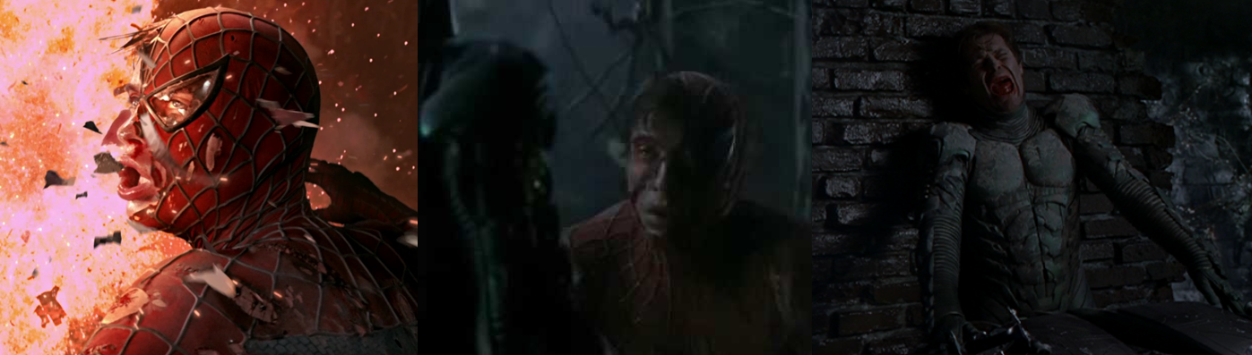 Having pieced together Spider-Man’s true identity, the Green Goblin terrorises Aunt May and kidnaps M. J. (since “everyone” knows that Peter has been in love with her since he was a kid) to goad Spider-Man into a confrontation. Earlier, the Green Goblin offered Spider-Man the choice to join him, something Peter adamantly refused; angered by the insult, the Green Goblin forces him to make another choice: between M. J.’s life and the lives of a trolley car full of little kids. Like any good superhero, Spider-Man finds a way to save both, though at great physical strain on his part. Thanks to a gaggle of prideful New Yorkers, he’s able to lower M. J. and the kids to safety but is violently dragged into a brutal fist fight with the Green Goblin. Assaulted by the Goblin’s superior technology, Spider-Man is bloodied, beaten, and battered, his reflexes and strength effectively neutered by the Goblin’s unrelenting assault. Spider-Man’s vicious counterattack is halted by the revelation that it’s Norman under the helmet; pleading with Peter to spare him, Norman tries to manipulate and prey upon Peter’s good heart in one last cruel effort to kill his foe. Of course, Spidey’s reflexes kick in and Norman ends up skewered on his own glider; with his last breath, he begs Peter to keep the truth from Harry, a decision that weighs even heavier upon Peter when Harry swears on his father’s grave to make Spider-Man pay for killing him. Additionally, the entire escapade has taught Peter that his powers and responsibilities as Spider-Man mean that those closest to him will always be at risk, so he selflessly chooses to walk away from Mary Jane after she suddenly professes her love for him in order to continue putting others first as everyone’s friendly neighbourhood Spider-Man.