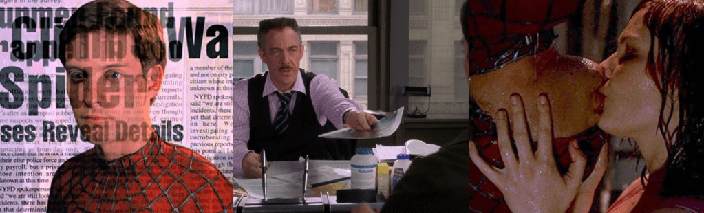 Heartbroken at having indirectly caused his uncle’s death by not using his great powers responsibly, Peter crafts a new costume for himself and vows to honour his uncle’s memory by fighting crime as Spider-Man. Although he quickly gains a reputation as a mysterious masked saviour, Spider-Man’s presence and motives are questioned by the pugnacious J. Jonah Jameson (J. K. Simmons), the editor of the Daily Bugle, who does everything in his power to tarnish Spider-Man’s name by branding him as a vigilante menace. This works in Peter’s favour, however, as he is able to sell Jameson exclusive and improbable pictures of Spider-Man in order to pay his way through college. However, his obsessive dedication to helping others as Spider-Man begins to put a strain on his personal life; Peter is fired from his job for being late and completely misses that Harry is now dating Mary Jane. On the plus side, this means Peter gets to interact with M. J. a bit more; since Harry is constantly trying to impress his father, he isn’t as attuned to her feelings and his solution to any problem is to spend money. As M. J. comes from an abusive home life, she wants more than frivolities; she needs to be seen as more than just a piece of eye candy for a change to have her voice and dreams heard. Although she is amazing by Spider-Man and fascinated by his mystery and abilities, Peter makes an equal impression by actually being there for her, listening to her, and offering advice, which soon comes to cause a bit of friction between him and Harry.