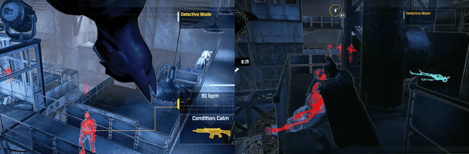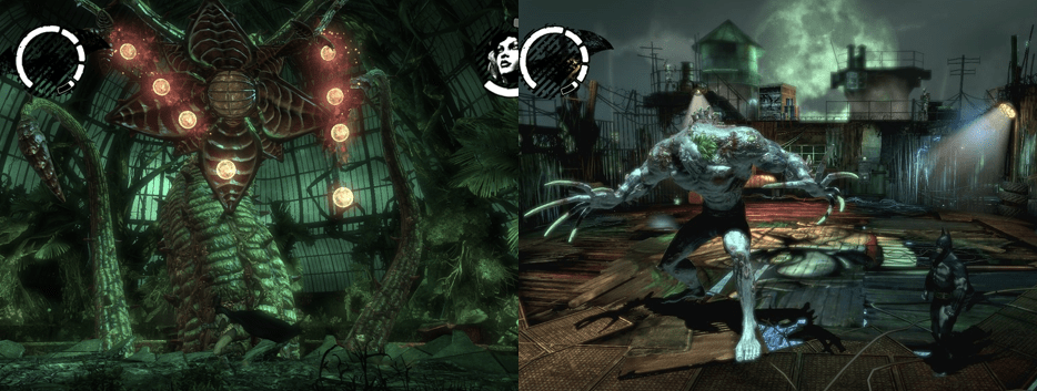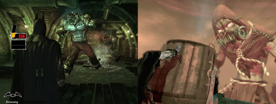 Before that, though, you’ll have to contend with Killer Croc in the sewers. Down here, you must slowly walk across wooden platforms to avoid attracting Croc’s attention; when he lunges out of the water, you must quickly toss a Batarang to subdue him and make a run for it when he starts smashing up the platforms. Eventually, you’ll avoid him and collect the samples Batman needs to synthesise an anti-virus for the TITAN formula and Croc will chase you down. This forces you to run towards the camera as quickly as possible and then detonate explosive charges before Croc can reach you to send him plummeting down a deep chasm. As mentioned before, you’ll also have to contend with the Scarecrow on no less than three occasions. Each time, you must navigate his hellscape using your stealth, gadgets, and jumping/shimmying skills to avoid being spotted but, as the encounters progress, you’ll also have to fend off waves of skeletons. In the final encounter, Scarecrow summons more of these enemies, including a TITAN variant, in three waves; after defeating each one, Batman activates a Bat-Signal and will eventually dispel and break free of the Scarecrow’s harrowing nightmares once and for all.