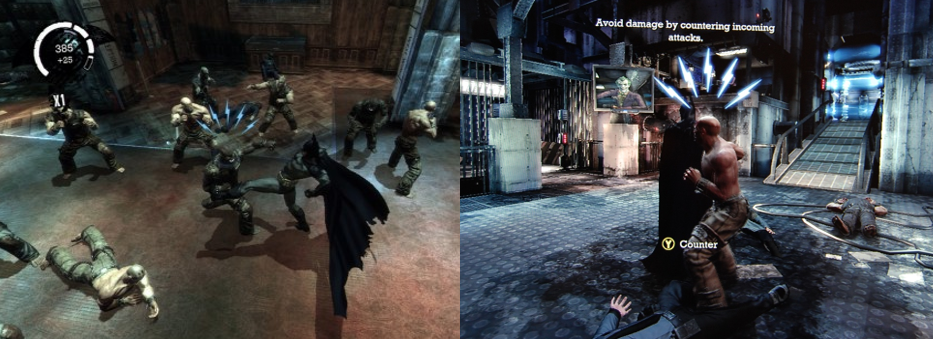 Of course, one of the most prominent aspects of Arkham Asylum is the game’s unique combat system.; rather than simply mashing buttons, combat is a fluid and slick affair somewhat akin to a rhythm game. Pressing X will see Batman strike the enemy nearest to him; repeated presses begin a combo and you can stun enemies with Batman’s cape by pressing B or hop over them by tapping A. During combat, the camera automatically pans to show you the best view of your immediate area and any enemies around you and, when enemies try to strike at you, a “Counter” indicator will appear. When it does, tap Y and Batman will automatically counter the oncoming attack and, by successfully stringing together strikes and counters, you can build up bigger and more elaborate combos and fluidly take down multiple enemies at once. Once an enemy has been knocked down, or when sneaking up on them, you can press RT and Y to perform a takedown that will knock them out cold and, as you defeat enemies and uncover secrets, you’ll earn experience points (XP) which can be spent purchasing new takedowns and combat options when you level up.