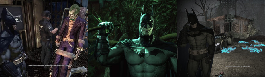 Additionally, there are stone monuments to Amadeus Arkham, the founder of the island and its facility, to be found and scanned to learn more about Arkham’s morbid history as well as audio tapes and maps to further flesh out the characters’ backstories and reveal the Riddler’s secrets. From the main menu, you’ll also see the option to take on Challenge Mode. These are specific, self-contained combat and predator sections based on encounters in the game and pit you against waves of increasingly difficult enemies and rooms full of thugs, respectively, and are unlocked by finding Riddler Trophies and solving riddles. When you take on a Challenge, you’ll either have to face a number of rounds against different enemies in different environments or pick off thugs from the shadows according to a number of requirements (such as using explosive gel or a vertical takedown). Each time you successfully meet these criteria, or rack up enough points, you’ll earn up to three medals, and eventually some Achievements, and can compete against friends and others using the online leaderboards. Sadly, though, unlike subsequent games in the series, there is no “New Game+” option, you only unlock one alternative outfit for completing the game and it’s restricted to the Challenge Mode, and the only DLC available is for additional Challenge maps. Those who have the PlayStation 3 or Return to Arkham (Rocksteady Studios/Virtuos Studios, 2016) versions (which I also do), though, can choose to play as the Joker in the Challenge Mode, which is pretty entertaining as he comes with his own unique and madcap fighting style and gadgets that separate him from the Batman.