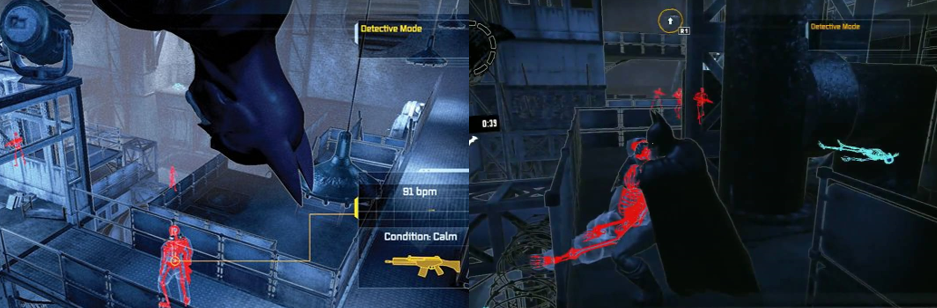 Another important aspect of the game is stealth; utilising the “Predator” mechanic, Batman can sneak up on enemies and make use of high ledges to stalk rooms full of armed thugs and pick them off one at a time by utilising the infrared filter offered by his “Detective Mode”. This is activated by pressing the Left Bumper and will wash the environment in a grainy, black and white filter that highlights enemies by their body heat and shows their current condition. Using the shadows and your gadgets, you can drop down on enemies from above, sneak through grates, and set up traps to take them down and pick them off and their cohorts will react accordingly, becoming increasingly agitated and trigger happy as the section progresses. Batman is extremely vulnerable to sustained gunfire so it’s better to be patient and take down each enemy one at a time but you can grapple away to safety if you’re spotted and are even able to take down enemies while hanging from ledges or from afar with Batman’s many toys. Detective Mode also allows you to scan your environment; for the most part, this will be to solve riddles placed all over Arkham Asylum by Edward Nashton/Edward Nygma/The Riddler but, at various times during the game’s story, you’ll have to set up a crime scene to scan evidence and filter out aromas and other elements that will lead you to your next objective as long as you have Detective Mode activated. Although there is no onscreen map, you can view a comprehensive blueprint of Arkham Island by pressing the “Back” button. From here, you’ll see all of the unsolved riddles in the game and where your next objective is, as well as being able to enter any of the game’s environments to review the layout and any remaining secrets to be discovered.