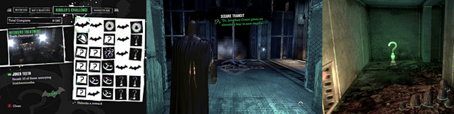 Batman: Arkham Asylum has forty-seven Achievements for you to earn, the majority of which are acquired simply by progressing through the story and clearing certain missions or defeating bosses. Some require you to defeat enemies in certain ways or rack up a certain combo score, others are tied to gliding consecutively or completing the game on each difficulty setting, but the majority are tied towards finding the Riddler Trophies, solving his riddles, and completing combat and predator challenges in the game’s “Challenge Mode”. To elaborate, the Riddler has hidden numerous glowing green trophies all across Arkham Island; some are hidden in plain view, others require your gadgets or a bit of exploration to find. Pretty much every single room or area of the island also has a number of riddles associated with it that you must solve by scanning parts of the environment; these are generally linked to Batman’s history or rogues and will unlock character biographies of guys like Harvey Dent/Two-Face and Arnold Wesker/The Ventriloquist. Every time you solve or find these, you’ll gain XP and get one step closer to 100% collection so it’s worth taking time to look for a small tea set or a plague dedicated to Martha and Tomas Wayne.