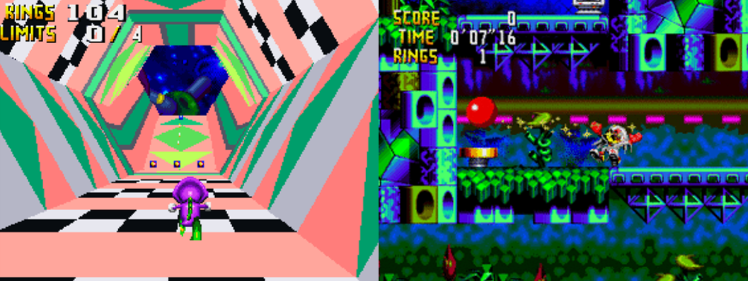 Sadly, the game is let down by how bland and uninteresting its level design is. Knuckles’ Chaotix is very similar to Sonic the Hedgehog CD (SEGA, 1993) in a lot of ways but primarily in how confusing and clumsy its stages are laid out; when Badniks do appear, it seems completely at random, and the few hazards you come across are so oddly placed that it’s easy to run head-first into them. Stages are also extremely cluttered at times; there’s often too much colour, too much sensory overload, and it makes everything blend together or difficult to look at, which really doesn’t help when you’re trying to figure out where the hell you’re supposed to be going. The game’s Attractions play things extremely safe with the likes of Botanic Base being a lush forest, Speed Slider being an amusement park, and Techno Tower being Dr. Eggman’s industrial blemish on the natural environment, much like the classic Green Hill, Star Light, and Scrap Brain Zones. The aforementioned Marina Madness and Amazing Arena thus stand out even more thanks to the their unique gameplay mechanics and presentation, and the game does get extra points for featuring different colour palettes for each Act to indicate a different time of day (morning, noon, evening, and night), though this really doesn’t help to stave off the recycled nature of each Act.