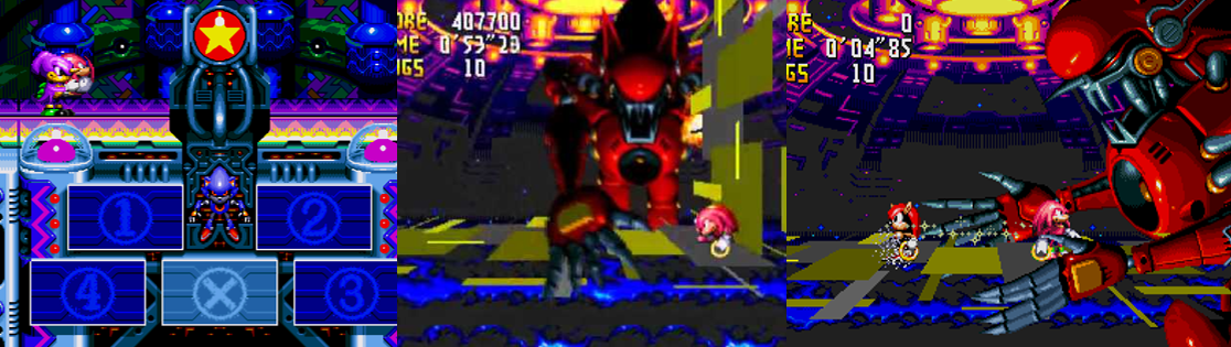 Dr. Eggman hasn’t really tried to reinvent the wheel in Knuckles’ Chaotix and is still using his tried-and-tested robotic creations, the Badniks, to hinder your progress. Unlike in the majority of other 2D Sonic titles, destroying Badniks doesn’t free a cute little woodland critter; instead, an uncollectible Dark Ring will drop out and disappear soon after, meaning that the few times Badniks do appear you’re robbed of any sense of satisfaction from destroying them. These Badniks are some of the oddest in the classic series, resembling a mish-mash of insects, tanks, and other creatures and mostly just floating around here and there. The only real standouts for me were Burboom and Blitz; Burboom can catch your partner and hold them captive and Blitz target you with homing missiles that fly across the immediate area to hurt you. While in Amazing Arena, you’ll also have battle a sub-boss, which is a massive mechanical version of Dr. Eggman that stretches its fists at you. The only way to damage it is to toss your partner into the head, which routinely floats back and forth at the top of the screen; although you can simply wait it out and the boss will deactivate, you won’t get the benefit of the Ring Monitors defeating it bestows upon you.