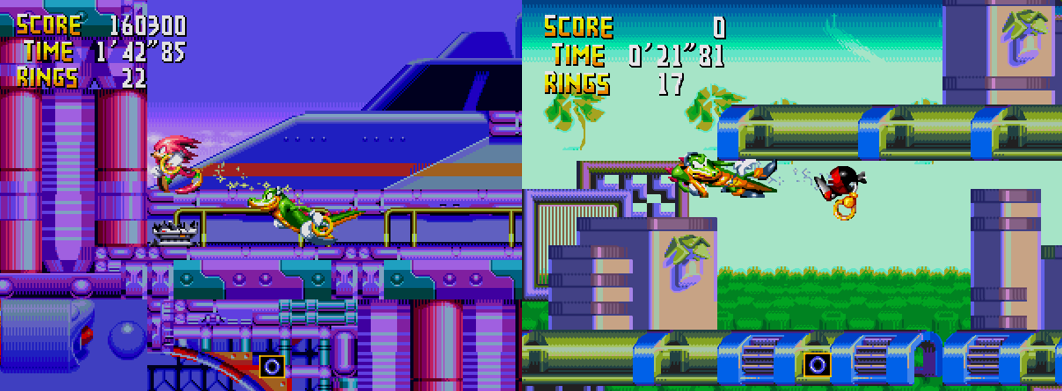 If there’s one area where Knuckles’ Chaotix excels, it’s the presentation; the game is undeniably gorgeous to look at, and easily the most vibrant and colourful Sonic title of its era. Each of the playable characters (with the exception of Heavy and Bomb) has an idle animation unique to them (Knuckles twirls his Combi-Ring in boredom, Espio cycles through different colours, Vector jams to his music, Mighty impatiently taps his foot like Sonic, and Charmy looks at you incredulously) and are some of the finest sprite work in the series. It’s such a shame, then, that Charmy is so goddamn small; obviously, he’s a bee and is supposed to be tiny but half the time you can barely see him, which is almost as disappointing as Mighty being a simple sprite swap of Sonic. Still, Espio and Vector look fantastic; each has unique and quirky running and jumping animations, and Knuckles’ sprites have been completely overhauled to make him more detailed and expressive than ever.