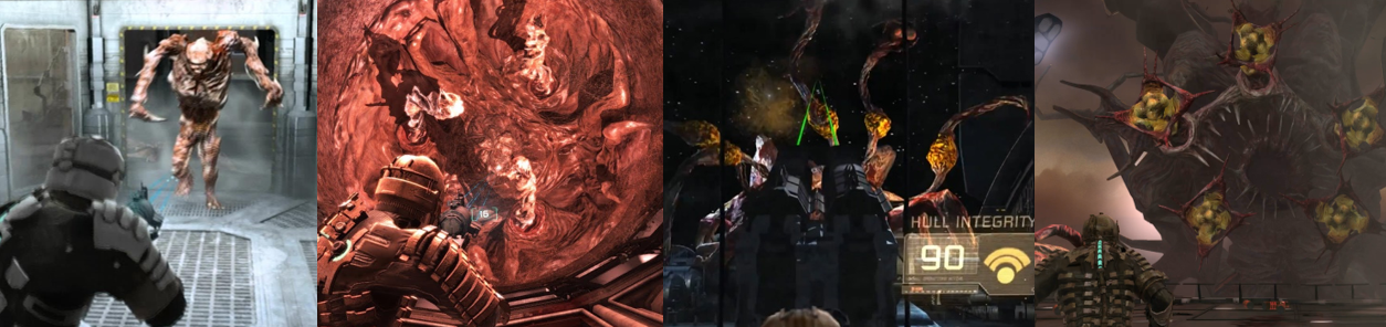 Isaac is hounded throughout his treacherous and nightmarish mission by demonic Necromorphs, which come in all shapes and sizes and are the result of a horrific alien virus that reanimates corpses and transforms them into shrieking, taloned beasts hungry for human flesh. The most common variant is the Slasher, a blood-soaked, malformed corpse that sports blade-like appendages and shambles towards you either alone or in groups. As with the vast majority of the Necromorphs, these are best dispatched by targeting their limbs rather than their central mass; dismember their insectile arms to keep them from skewering you, and cut off their legs to slow their movement, but be sure to make sure they’re really dead as these bastards have a tendency to take a lickin’ and keep on tickin’! Other common enemies includes the Lurker (a sort of disembodied head that sports three tentacles, hops all over the walls and ceilings, and fire projectiles at you), the Leaper (which, as its name suggests, leaps at you (appearing to float in zero gravity areas) and scuttles across surfaces whipping its scorpion-like tail at you), and the bulbous Pregnant (which lumbers about and bursts forth a swarm of tiny Necromorphs that can quickly whittle down your health bar). Rather than facing off against a boss at the end of each chapter, Isaac will generally encounter newer and deadlier variants of the Necromorphs in each area: The Exploders shuffle about and try to blow you up with their huge, explosive arm (which you can shoot to blow them up, and any nearby Necromorphs), bat-like Infectors will try to attach themselves to you and cause any nearby corpses to burst to life as dangerous Necromorphs, and the corpse-like Dividers are gangly, gory corpses that split into smaller, equally dangerous Necromorphs after being downed.