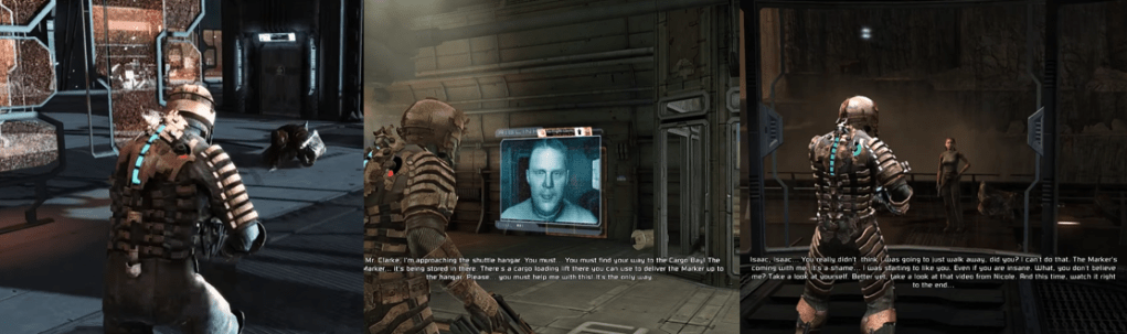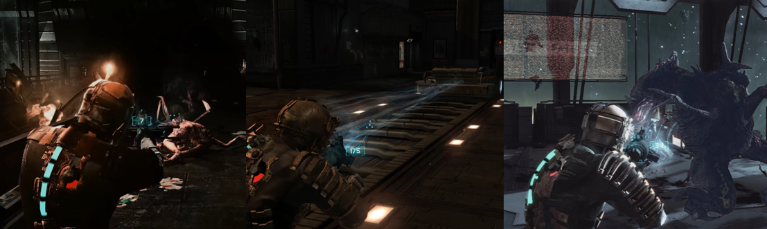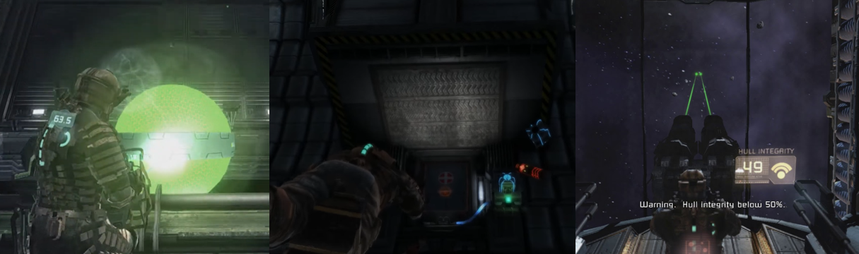 You don’t really interact with too many NPCs outside of holographic messages, video calls, or seeing them shielding behind glass or trapped in other rooms. There are some exceptions, however, such as Isaac’s frequent encounters with his wife, Nicole, who he thought was dead and whose voice and memories haunt him throughout the story. Although Isaac himself doesn’t actually talk (always a weird decision for a third-person shooter, I find), you can review his thoughts in his mission log and objectives, and he cuts a formidable and interesting figure. His suit and helmet are instantly iconic and, though they hide his face throughout the game, they make him seem almost as horrific as the creatures he encounters and his grunts of pain and panting wheezes when in a vacuum or running low on health really add to his otherwise blank personality. Transferring the HUD to Isaac’s suit and weapons is a great way to keep the screen from getting too cluttered, and the use of ambient sounds (particularly a haunting rendition of “Twinkle, Twinkle, Little Star”) really add to the game’s horrifying, ominous sense of dread and claustrophobia. Even brightly lit or familiar areas aren’t always a safe haven as the ship can be thrust into a lockdown or dead bodies can suddenly burst to life as Necromorphs, often even while you’re trying to save the game.
