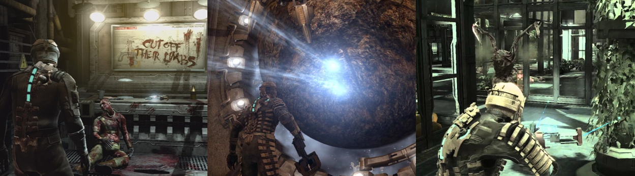 If I had to use one word to describe Dead Space, “atmospheric” would spring instantly to mind. Players spend the majority of the game exploring a deep space mining vessel, the Ishimura, which has been absolutely wrecked by the outbreak of the Necromorph virus. Dead bodies, blood stains, claw marks, and even dismembered NPCs are all over the place; sometimes they’re still alive and shoot themselves in a frenzy, other times they’re torn apart by Necromorphs, and there’s one harrowing moment where it looks as though a mass suicide has taken place. Ominous words written in blood can be seen everywhere and you can never be too careful when turning a corner as Necromorphs have a nasty tendency to burst out from air vents, glass capsules, or from every nook and cranny to attack you. Sometimes, a massive tentacle will grab at you and drag you around by the ankle, forcing you to blast at its tumour-like weak spot, and visibility it often low thanks to a foreboding darkness, intermittent lighting and power failures, and bursts of flames and electrical sparks in the flickering darkness.