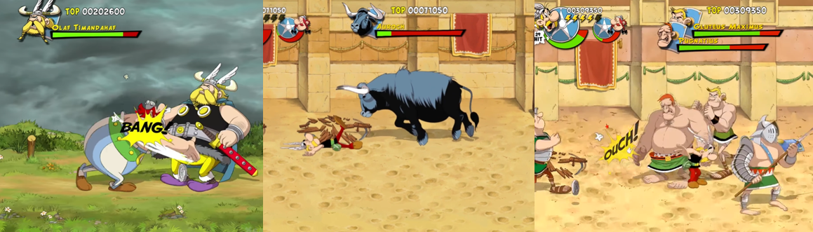Thankfully, there are some visually unique bosses to fight, though you can pretty much use the same tactics you use against all of the others to best them. Olaf Timandahaf might look intimidating but he’s no different from the Centurion except he uses a sword (which can get stuck in the ground) and performs a rhino-like charge. Similarly, the Auroch you fight in Act III is probably the easiest boss battle as there aren’t any other enemies to distract you and you simply jump over it when it charges and pummel it at every opportunity. Pugnatius, a man mountain of a Roman enforcer, pops ups in Act V; though he sports a clubbing punch and a double-handed clap attack, he’s very slow and a massive target so he only really becomes a threat when he teams up with Gluteus as the final bosses of the game. Before you reach that point, though, you need to fight through a whole bunch of gladiators, lions, brutish Romans, and the sadly underutilised Insalubrius, a whip-wielding gladiator who pummels you with punches if you get too close. Pugnatius and Gluteus form quite the formidable duo for the finale, especially as they’re backed up by other large enemies, but it’s not a massive stretch of your skill to isolate one or even attack both with a combo and I was a little disappointed that there wasn’t a more visually distinct enemy to face in the end. The lack of a chariot race and other recognisable Asterix baddies bad the game’s bosses needlessly repetitive; I don’t expect to go one-on-one with Julius Caesar, but I was a little disappointed that the game didn’t crib more enemy types from the various Asterix comic books.