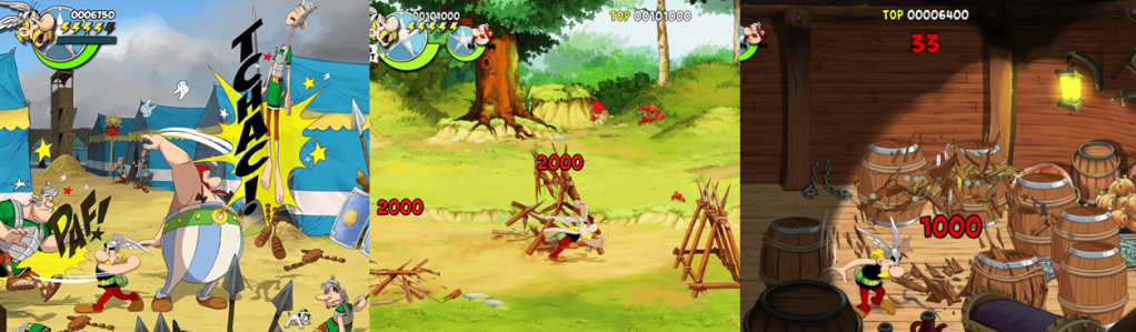 As you battle through the game’s environments, you’ll come across a number of barrels that can be smashed apart to yield coins; coins and bags of sestertii also drop from enemies and all add to your score, though there’s very little incentive to collect these beyond earning an Achievement. Smashing barrels also uncovers apples, legs of meat, and roast boar to refill your health but there are no other power-ups to find here. There’s no invincibility, no allies to call in, no temporary buffs to your strength or defence, and no weapons to pick up. Obelix doesn’t even use his trademark menhir and the only way you’ll drink magic potion is by switching to Asterix, who automatically swigs from a gourd before a fight.