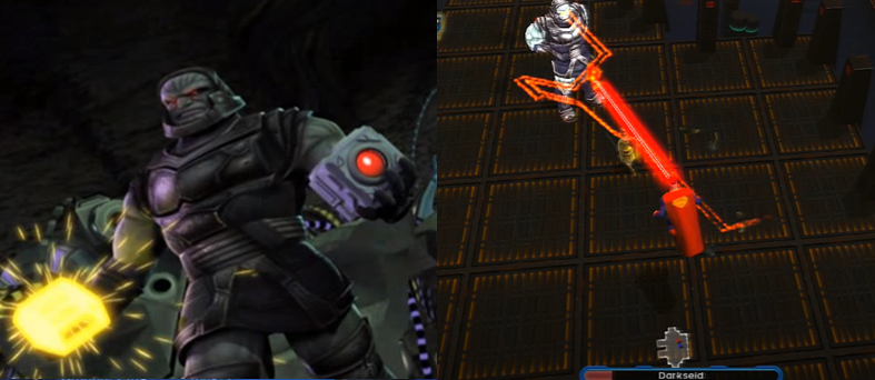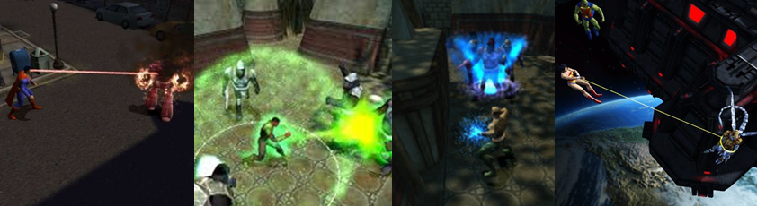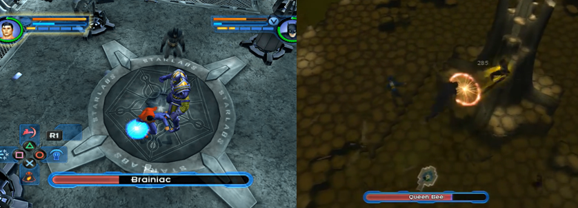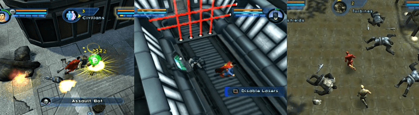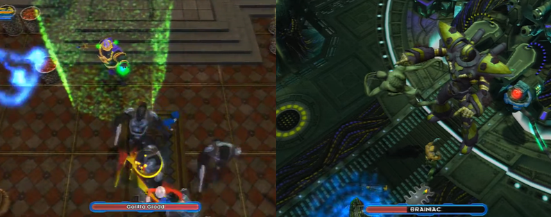 Before you can defeat Brainiac, you’ll have to battle a number of bosses; some of these are simply bigger, more dangerous versions of enemies you’ve already fought or Brainiac’s more deadly robots and duplicates. You’ll battle a Brainiac duplicate in S.T.A.R. Labs, for example, but this fight isn’t just about throwing punches. Instead, you have to activate consoles to lower barriers and rescue the scientists against a time limit all while “Brainiac” fires lasers and energy blasts at you. You’ll also encounter some of the more obscure villains from DC Comics’ gallery; Queen Bee has established a hive in the Metropolis subway and is transforming civilians into monstrous insect hybrids and, when you confront her in her throne room, she shields herself from your attacks and rains missiles into the arena that make the floor sticky. She’s only vulnerable when she leaves her throne but your window of opportunity to attack her is hampered somewhat by her minions, her energy blasts, and her tendency to dart across the screen like a madwoman. You’ll also butt heads with the Key, of all people. Like with Brainiac’s duplicate, you have to rescue some scientists against a time limit during this battle but the Key proves to be a particularly elusive and versatile enemy as he teleports around the place and causes hazards to blast out from his dimensional portals.