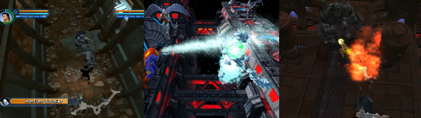 Similarly, when fighting Doctor Louise Lincoln/Killer Frost, you’re given one minute and forty seconds to destroy three missiles (and five seconds to get away from each before they explode) in addition to battling her and her icy minions. Killer Frost can conjure grunts, form ice shields, and blast at you with ice and icicles, all of which can make battling her quite tricky and annoying as your attentions are constantly divided. After reaching the core of a pyramid-like structure on Mars, Superman and the Martian Manhunter have to battle the White Martian leader; this guy is also accompanied by disposable White Martian grunts and you’re tasked with activating four nearby power nodes to defeat him. Things get noticeably more interesting when the Justice League splits into teams; while one team flies through the upper atmosphere destroying generators on invading spacecraft, another destroys power turbines in Gorilla City and gets into a confrontation with Gorilla Grodd. Grodd primarily uses his staff to attack and is joined not only by an inexhaustible supply of gorilla minions but also a series of energy-firing turrets so it’s probably best to try and keep your distance and stay on the move to emerge victorious in this fight. After battling their own security system in their Watchtower space station, the Justice League then faces off with a larger, more powerful Doomsday clone that, unlike pretty much every other boss in the game, boils down to a question of who can attack hardest and fastest rather than distracting you with tricks and puzzles.