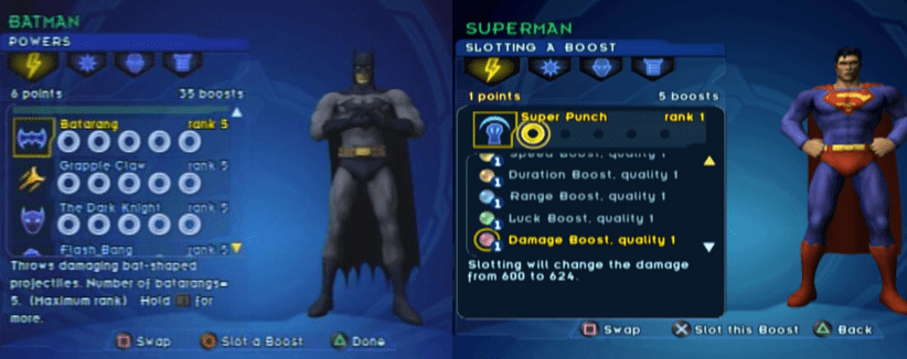 You’ll notice, however, that neither Huntress, Aquaman, or Hawkgirl have an L1+R1 special move, though I’m not entirely sure why. You can also unlock Hal Jordan and Kyle Rayner but, despite these two being separate characters, they control exactly the same as John Stewart, which is a little disappointing; none of the unlockable characters have alternate costumes either, which is a bit of a missed opportunity in my book. Initially, you can select from Easy, Normal, or Hard difficulties but you’ll unlock two more difficulty levels (Elite and Superhero, on which most enemies will kill you in one hit) and be given the option of starting the game over from the beginning with all of the upgrades and EXP you amassed during your run upon completing the game. Sadly, there’s no option to free play any mission with any character, no versus mode, and no option to play online or with more than one other player but there are a number of cheats that you can activate from the pause menu to give yourself invincibility, infinite energy, all upgrades, and a bunch of Shields to quickly unlock all of the game’s skins and characters.
